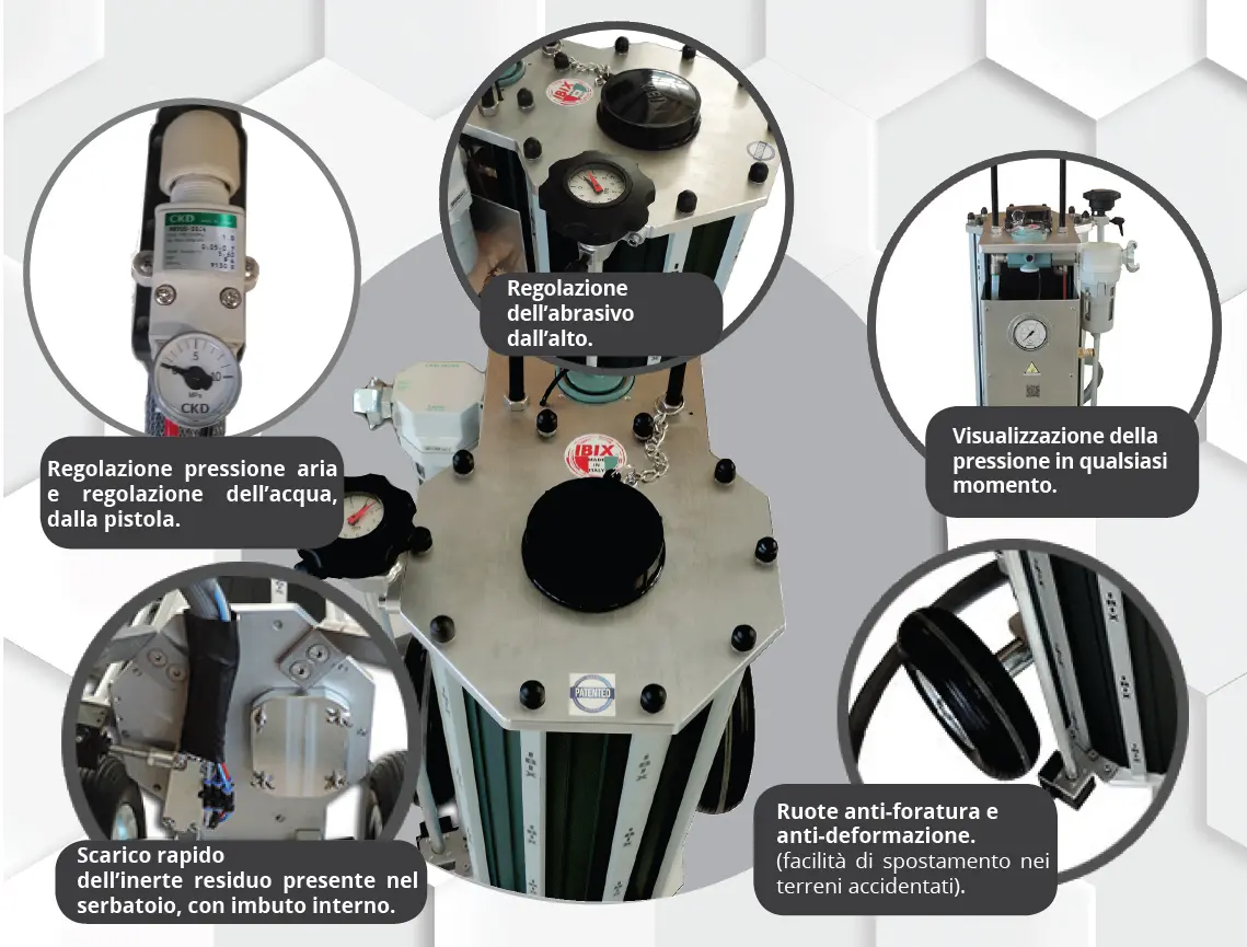 La IBIX Phoenix è progettata per garantire il massimo controllo, efficienza e praticità, rendendo ogni operazione di sabbiatura più veloce, sicura e confortevole.